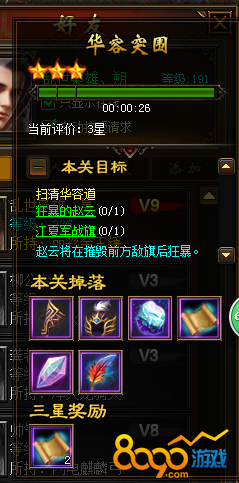 华容突破有星级评价,星级越高所获得奖励越为丰富。击杀小兵及武将都可以顺利提高奖励。通关条件是,在击倒江夏军战旗,再击杀狂暴的赵云。第二关的BOSS为张飞,第三关是关羽,通关条件类推。需要注意的是,副本通关时间也是奖励的重要衡量标准。