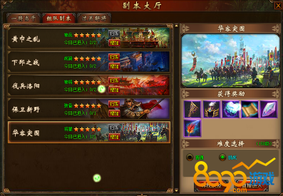 玩家在副本大厅,找到华容突破的进去界面。副本主要掉落一些游戏物品。同时,有普通和挑战两种难度可以选择。顺利通关后是可以进行扫荡的。副本进入次数可以在重置选项进行重置。
