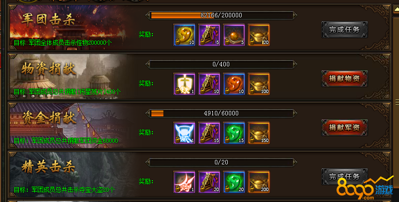 三国令中军团击杀,军团全体成员击杀怪物两百万哥,即可获得玄武勾玉初级神将丹初级战功牌绑定元宝。物资捐献军团成员总共捐献将星残片400个。资金捐献军团成员总共捐献军团资金60000.精英击杀军团成员总共击杀夺宝大盗20个。