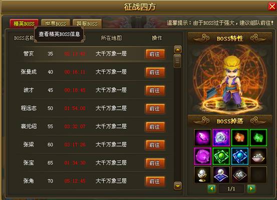首先三国名将精英BOSS大多分布在大千万象1-3层,而精英BOSS所掉落的东西包括强化石、洗练石、暴击宝石、坚韧宝石、孔雀石、各种修炼丹,此外还能获得大量经验以及声望和荣誉。精英BOSS的等级也有标明,这样玩家可以就BOSS的战力与自己战力进行对比。