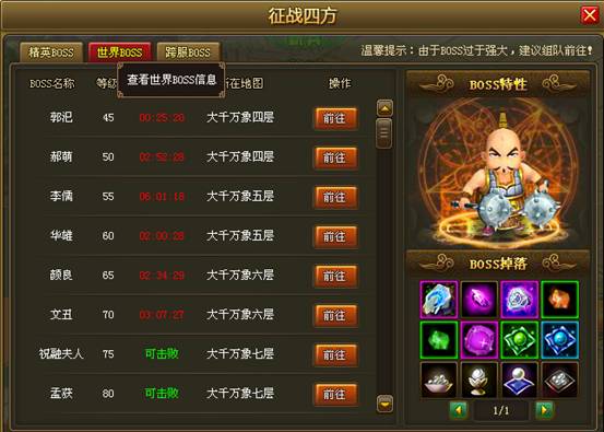 世界BOSS大都聚集在大千万象地图4层。而相对于精英BOSS来说,难度也有很大的提升,但是所获得奖励却比精英BOSS更丰富。因为多了一个幻化石。这个道具对于很多非RMB玩家、小R玩家有着很大的吸引,因为击杀的越多,自己可以幻化坐骑的次数也就越多。可以省下很多RMB购买其他东西!