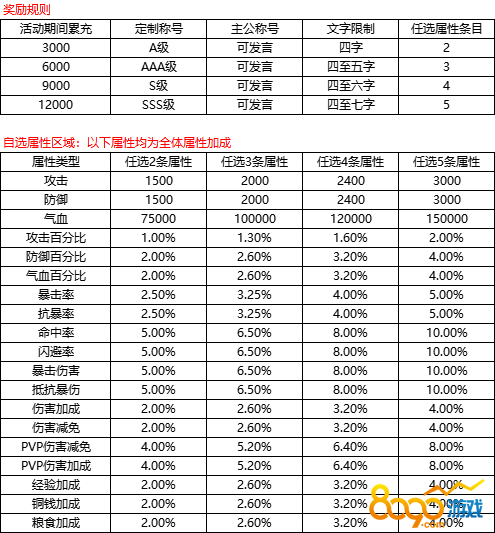 充值达3000元,可定制A级称号,文字4字,自选稀有属性2条