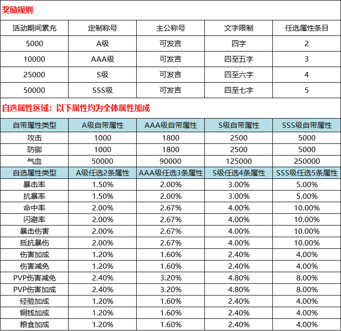 活动期间,累积充值达到指定档位可额外获得个性定制称号,个性称号拥有炫酷外观、自定义文案、稀有属性、发言特效