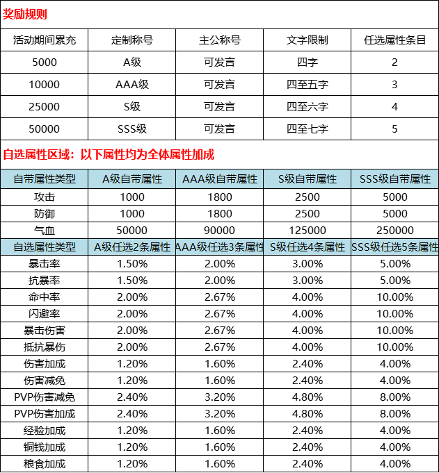 活动期间,累积充值达到指定档位可额外获得个性定制称号,个性称号拥有炫酷外观、自定义文案、稀有属性、发言特效