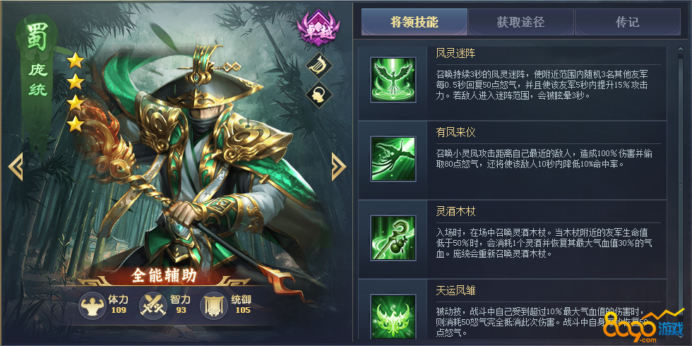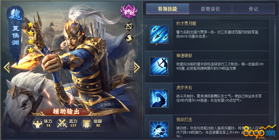 半辅助半输出将领,输出较高高,三技能开局加急速恢复怒气,能让己方武将更快的释放技能,能搭配四技能降低防御,让己方打人伤害更高。