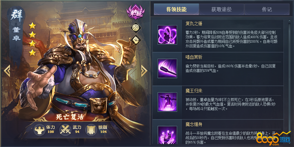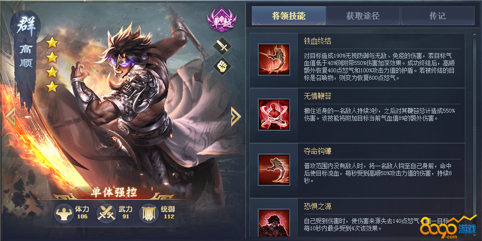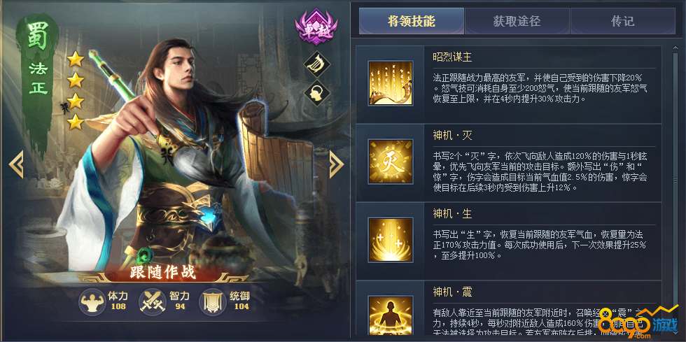 平民神将,可以斩杀血量低的将领,搭配诸葛亮、陆逊之类能压低敌方血量的将领能发挥出最大的作用,三技能能拉取和自身对位的敌方将领过来,配合自身减少敌方怒气的技能,开战时能拉到敌方的核心输出,战斗就已经赢了一半。