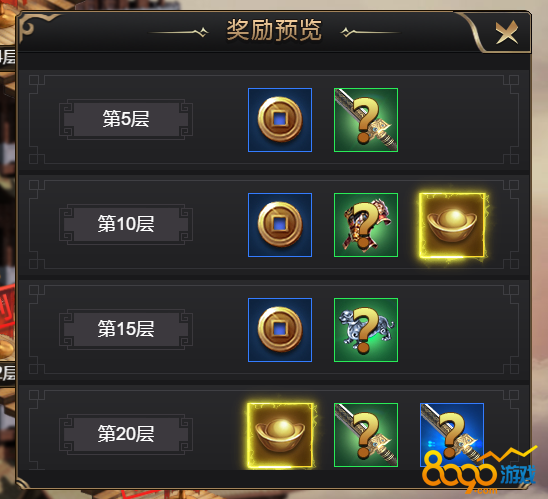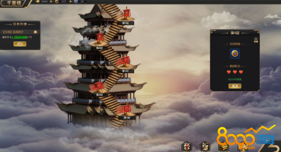 搜索"8090网页游戏"8090《三国群英纪》千重楼类似刷塔一样,玩家们需要一层层的挑战,只有通过了本层的挑战才能进入下一层。