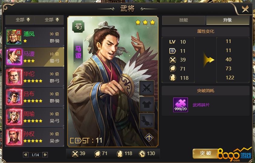 3.每十级武将需要突破一次,突破消耗武将碎片,不同颜色的英雄突破需要的碎片品质和数量不同;