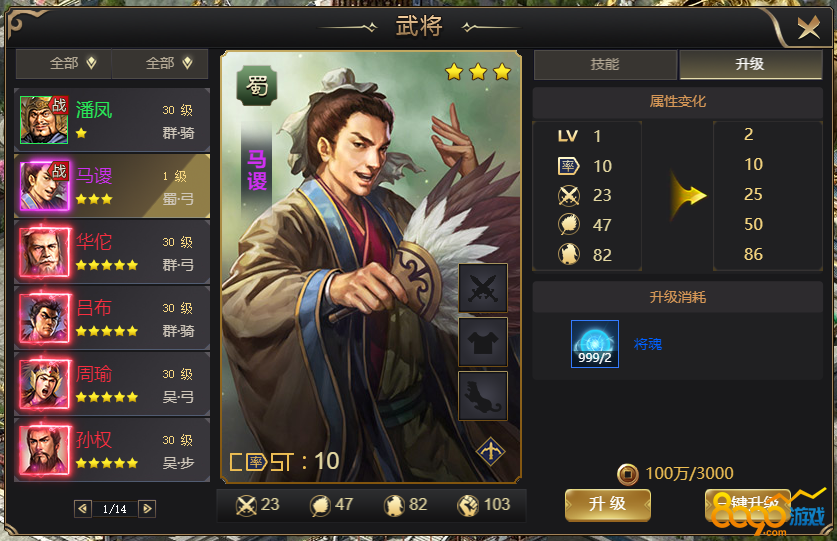 2.通过消耗将魂和金币可升级武将,武将每升10级可激活一个武将技能,最高等级上限为30级;