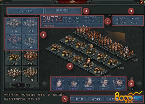 6. 上阵位置分后军、中军、前军。不同的军种放置不同位置,会产生不同的战斗结果