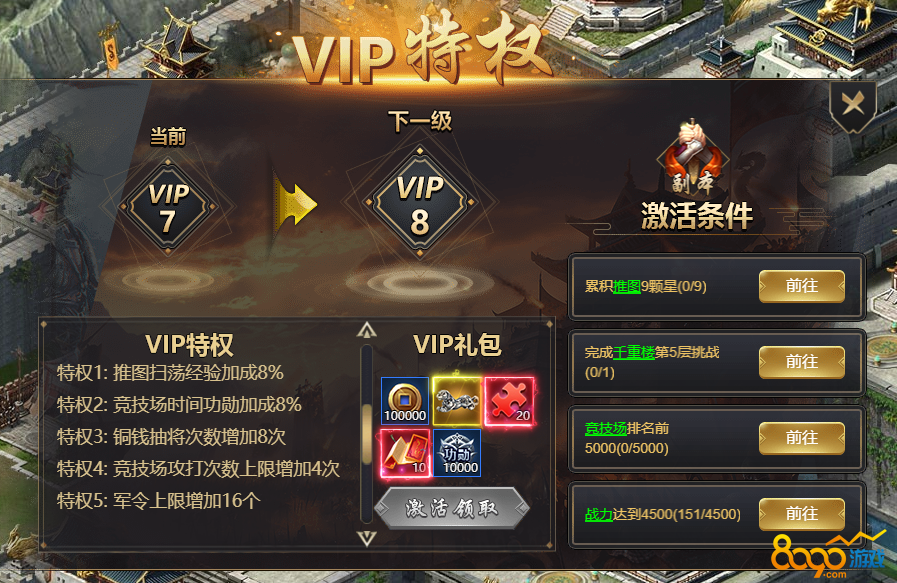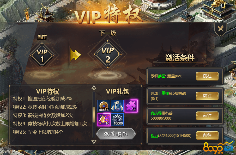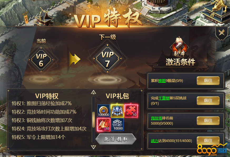 本游戏达成激活条件即可免费激活VIP;