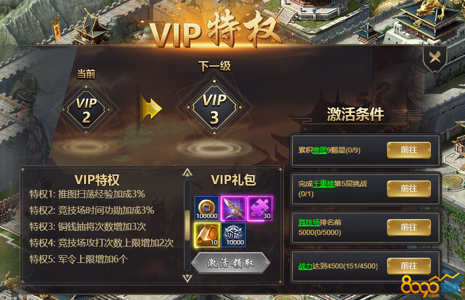 每级VIP都有对应的4个激活条件,全部达成便可激活领取VIP礼包,享对应VIP特权。