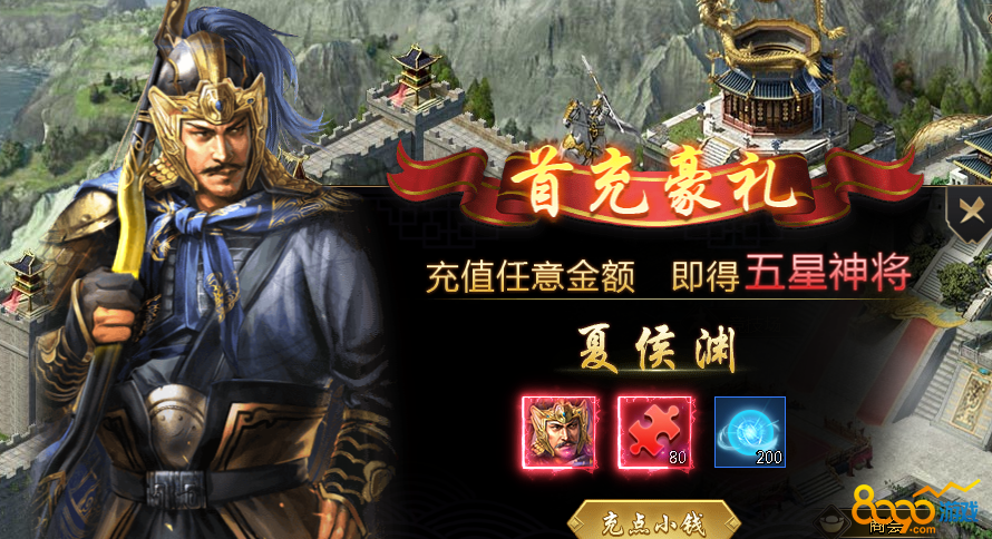 首充任意金额即可获得五星神将夏侯渊,还有80个神将碎片,200个将魂。夏侯渊作为曹魏阵营的大将,而且是首充送的武将,资质技能肯定是不错的,下面介绍一下!