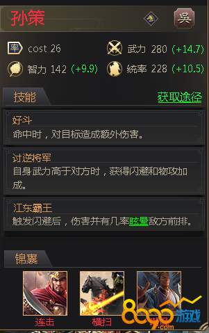 讨逆将军:兵力高一对方时,获得闪避和武功加成。