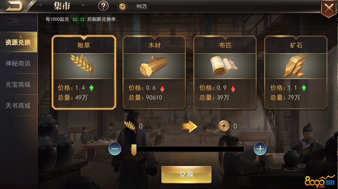搜索"8090网页游戏"8090《三国战》玩家可以在这里使用粮草、木材、布匹和矿石兑换为铜钱,兑换比例每2小时更新1次。