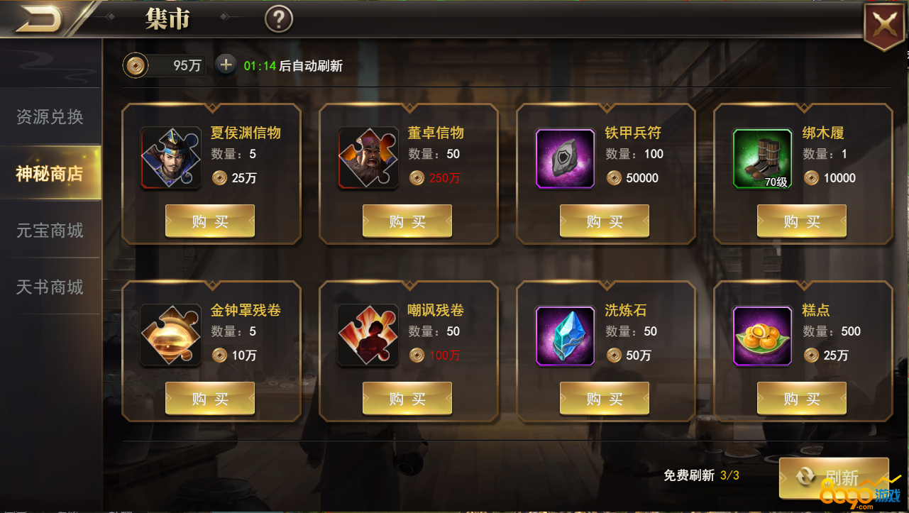 玩家可以使用铜钱在这里购买武将信物、装备、天书残卷、兵种兵符、拜访礼物、洗炼道具等,点击刷新按钮会刷新道具。 注:神秘商店只会出现玩家已经解锁的天书残卷