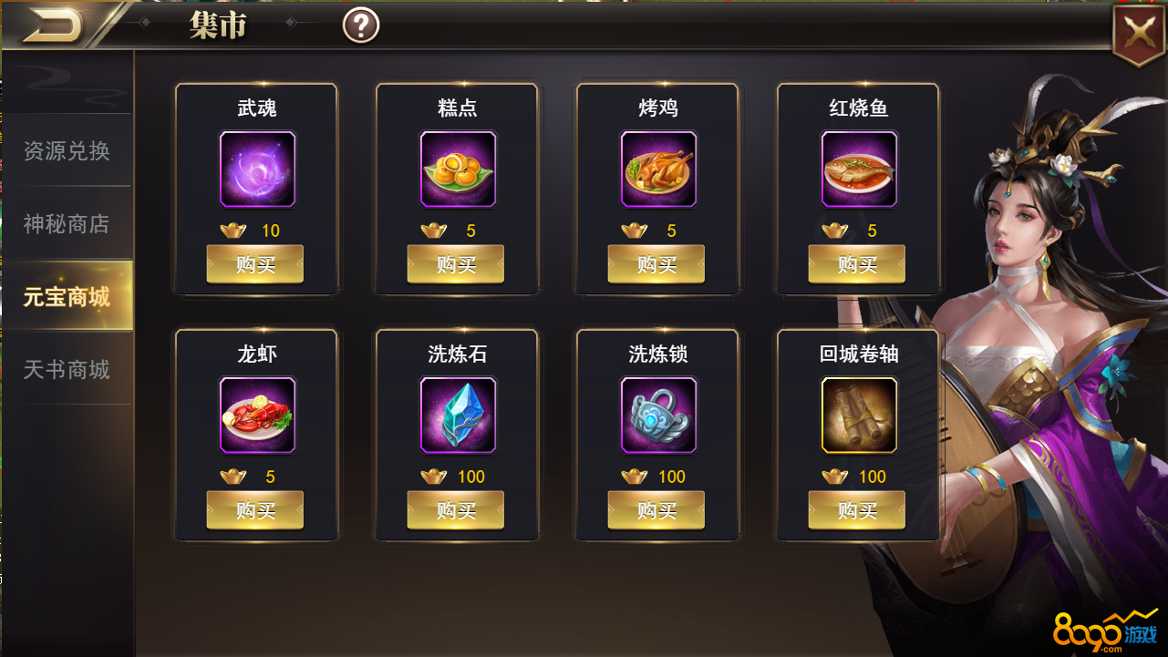 玩家可以消耗元宝购买将魂、拜访礼物、洗炼道具以及回城卷轴