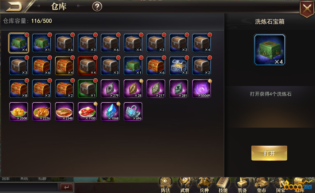 仓库中展示了玩家除武将信物、星石、符文之外的所有物品,同时玩家可以在这里开启宝箱