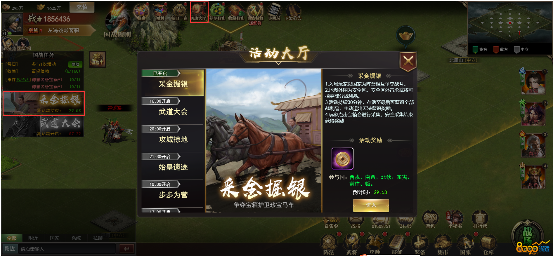 8090《三国战》活动开启时玩家可通过主界面的【活动大厅】中的采金掘银页签按钮按钮进入,或点击主界面左侧的活动栏进入【采金掘银】场地。