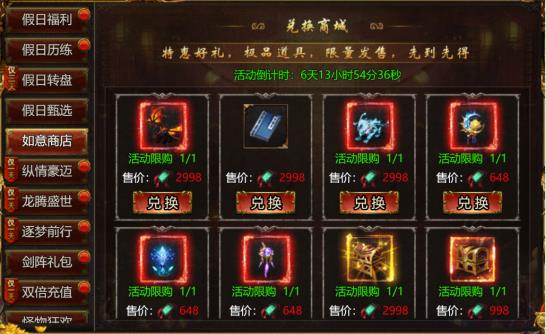 【活动内容】:活动期间,可使用如意令兑换冰龙幻化、徽记等极品道具,限量发售;