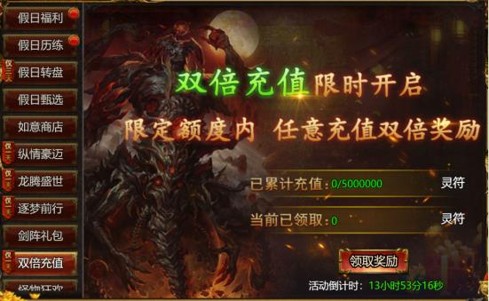 【活动内容】:活动期间,限定额度内任意充值领双倍灵符。