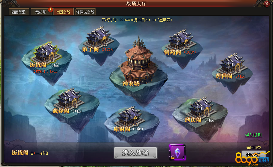 每隔一定时间将开启七阁之战,玩家可以家族为单位与其他家族争夺分阁的占领权,成功占领分阁的家族每天可获得大量奖励。