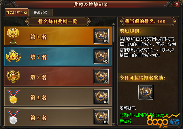 玩家只要进行挑战,即可获得每日排名奖励,奖励大量荣誉点数,每日0点进行发放,排名越高奖励的荣誉点数就越多