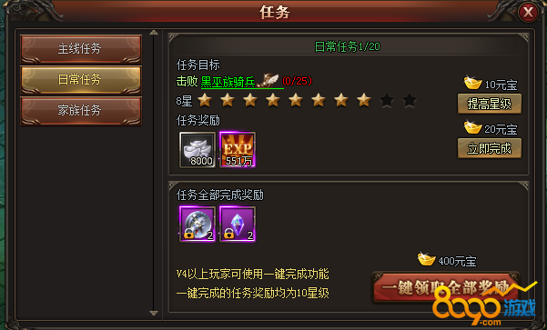 玩家若觉得完成任务过于麻烦,可选择“立即完成”功能,该功能可使玩家角色立即获得当前星级的对应奖励,但同时也需要消耗一定数量的元宝