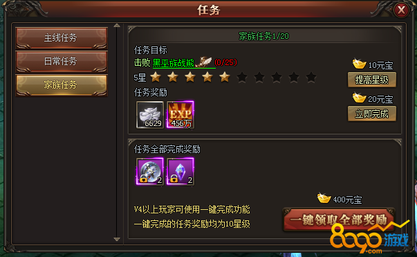 家族任务将有不同的星级代表其任务品质,任务品质越高,完成之后获得收益也就越高,玩家可通过消耗一定数量的元宝提高任务品质