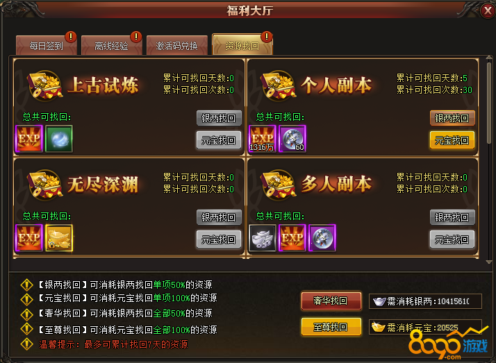 【元宝找回】可消耗元宝找回单项100%的资源