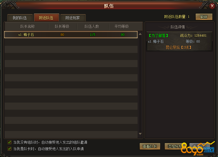 l 玩家查看当前场景中的队伍信息,选中未满员的队伍点击【申请入队】即可申请加入
