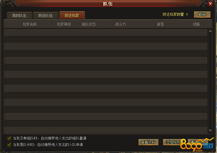 在组队界面中点击【附近玩家】标签可查看当前场景内所有在线玩家,方便玩家组队,在一些pvp的战斗场景中更可查看场景中其他区服的人员数量等信息,可谓知彼知己方可百战百胜
