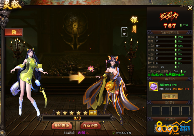 灵狐自带角色20%的属性,玩家可以通过升级灵狐的阶级来提升灵狐继承角色属性的百分比,灵狐阶级越高,继承角色的属性就越高,最多可继承100%的角色属性,灵狐无法被怪物或者是玩家直接选取为攻击目标