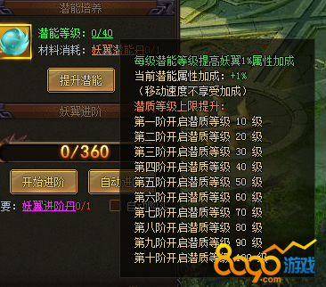 玩家除了采用妖翼进阶来提升属性加成以外,妖翼的潜能也是属性加成的渠道之一,妖翼的潜能等级将受限于妖翼的阶数,妖翼阶数越高,潜能等级升级上限也就越高,每一级潜能等级将提升 1%的总属性加成,故当玩家妖翼阶级越高,潜能带来的属性提升也就越高