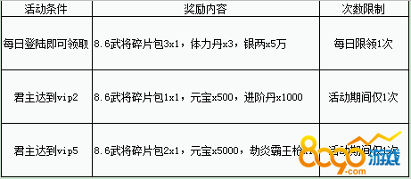 【活动内容】活动期间内,主公每天登陆游戏即可领取1份登陆礼包,同时达到相应VIP等级,还可领取1份vip礼包,vip礼包只可领取1次!
