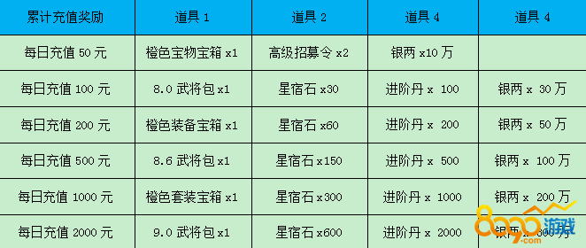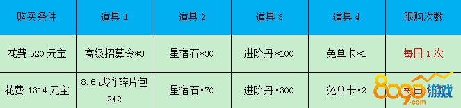 520福利包内含:高级招募令x 1、体力丹x 5、进阶丹x 520、9.0武将兑换券Ax 1