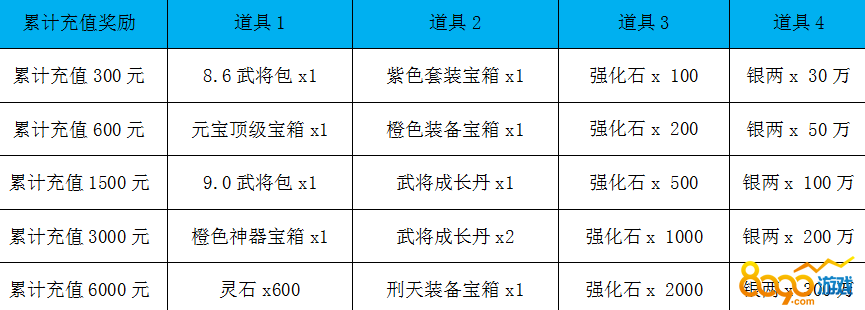 活动期间,玩家累计充值满600元,免费领取8.6武将包x1