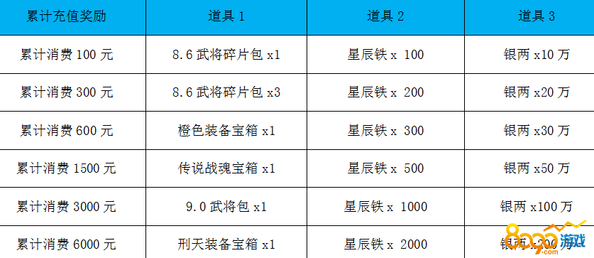 活动期间,玩家累计充值满3000元,免费领取 9.0武将包x1