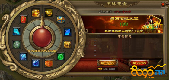 【活动内容】活动期间,玩家每次抽奖消耗30元宝,每次抽奖将会有10元宝注入奖金池,玩家每次转动可以有机获得活动奖金池的10%奖金,25%奖金,50%奖金,100%奖金元宝。
