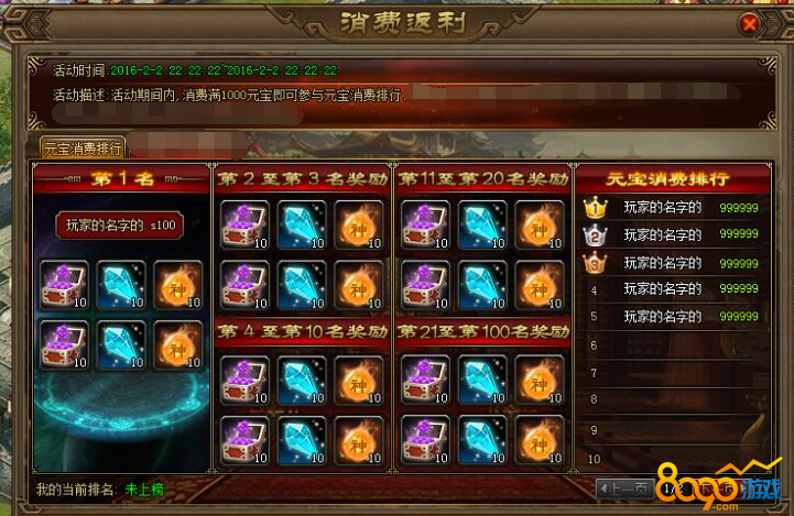 【活动内容】活动期间,玩家消费满2000元宝,便可参加元宝消耗排行榜。活动结束后排行榜奖励将会通过系统邮件自动发放。(活动UI参考,具体以游戏中活动为主)