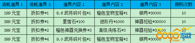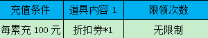 【活动内容】活动期间,每累计充值满100元即可领取一张折扣券,获得的折扣券可在折扣界面使用花费少量元宝购买道具。