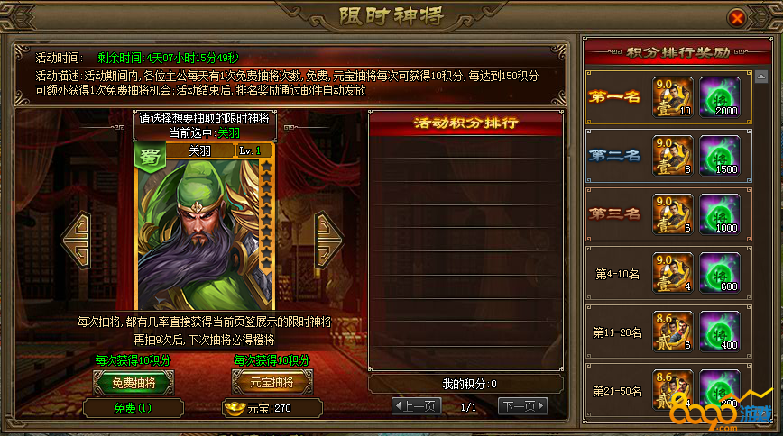 【活动内容】活动期间,各位主公每天有一次免费抽奖次数。免费及元宝抽将每次可获得10积分,计算入积分排行帮,参与获得积分排行奖励,且每达到150积分可额外获得1次免费抽将的机会。