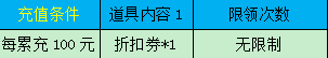 【活动内容】活动期间,每累计充值满100元即可领取一张1折折扣券,获得的折扣券可在折扣界面使用花费少量元宝购买道具。