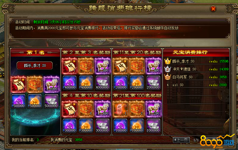 【活动内容】活动期间,玩家消费满2000元宝,便可参加元宝消耗排行榜。活动结束后排行榜奖励将会通过系统邮件自动发放。