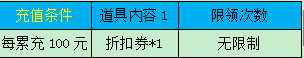 【活动内容】活动期间,每累计充值满100元即可领取一张1折折扣券,使用折扣券+1元宝购买超值奖励。