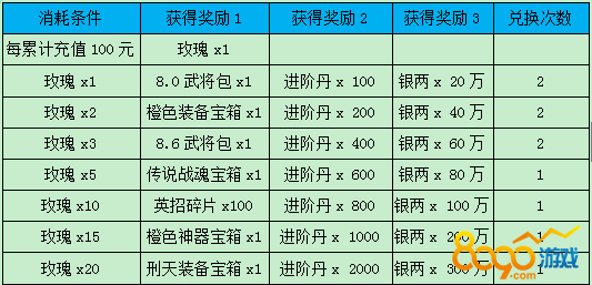 活动期间,每累计充值满1000元宝可获得一朵玫瑰,玫瑰可在兑换界面兑换精品奖励!