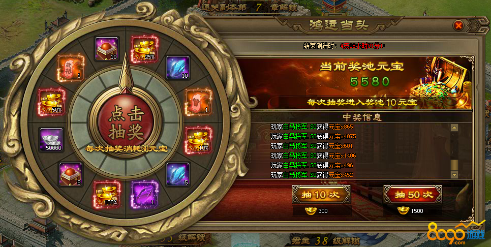 【活动内容】活动期间,玩家每次抽奖消耗30元宝,每次抽奖将会有10元宝注入奖金池,玩家每次转动可以有机获得活动奖金池的10%奖金,25%奖金,50%奖金,100%奖金元宝。(活动参考UI,具体以游戏中为主)