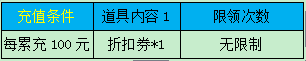 【活动内容】活动期间,每累计充值满100元即可领取一张1折折扣券,使用折扣券1元宝购买超值奖励。
