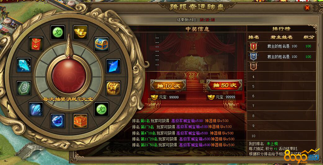 【活动内容】活动期间,玩家每次抽奖消耗一个好运符,每次抽奖将会获得一个排名积分,活动结束时排行榜奖励将会通过系统邮件自动发放!(活动参考UI,具体以游戏中为主)