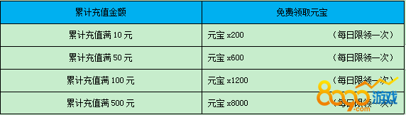 【活动内容】活动期间,每日累计充值达到对应条件,即可获得大量元宝返还!